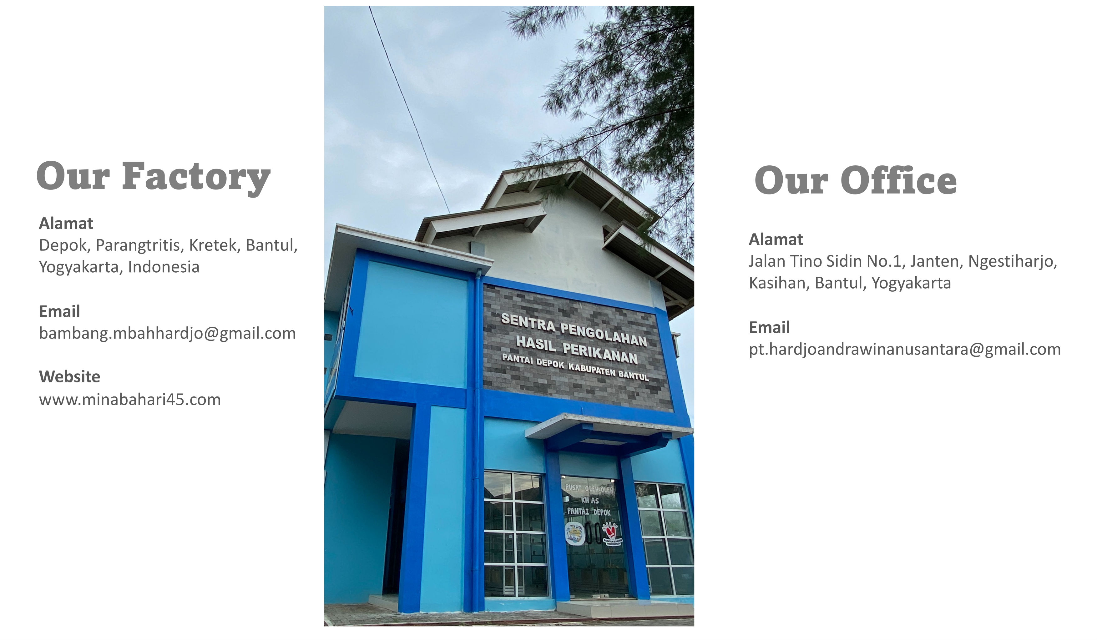 PT Hardjo Andrawina Nusantara (HAN) is an artisan food processing and business development. The Company itself was established in 2022 in cooperation with Unit Pengolahan Ikan Mina Bahari 45. Unit Pengolahan Ikan (UPI) Mina Bahari 45 (MB45) located in Depok Beach, Bantul Regency, Special Region of Yogyakarta.